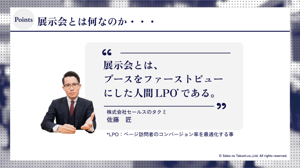 年間に10回以上出展し累計で数千件の商談を獲得する企業もおり、通常のマーケティング施策では考えられない圧倒的な成果です。この成功のカギとなったのが、展示会を「人間LPO」すなわち「人が行うランディングページ最適化」と捉えたアプローチです。