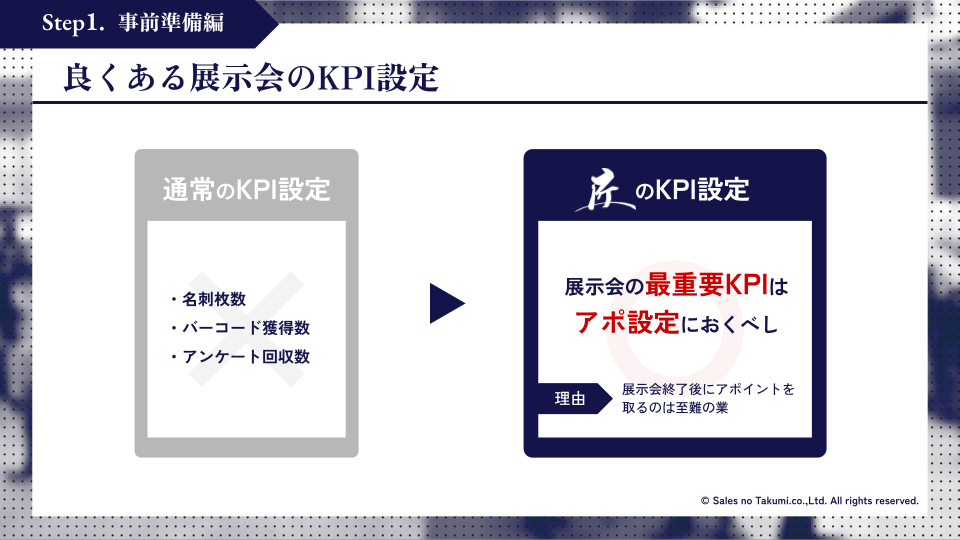 まずは、出展の目的・KPI(リード数/商談数/受注額など)とターゲットペルソナを明確にし、なぜ・誰に向けた展示会なのかを言語化します。