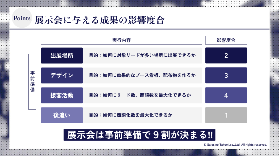 展示会出展の成否は事前準備でほぼ決まると言われます。実際、展示会は「当日が勝負」と思われがちですが、開催前の準備段階で成果の9割が決まるのが実情です。
